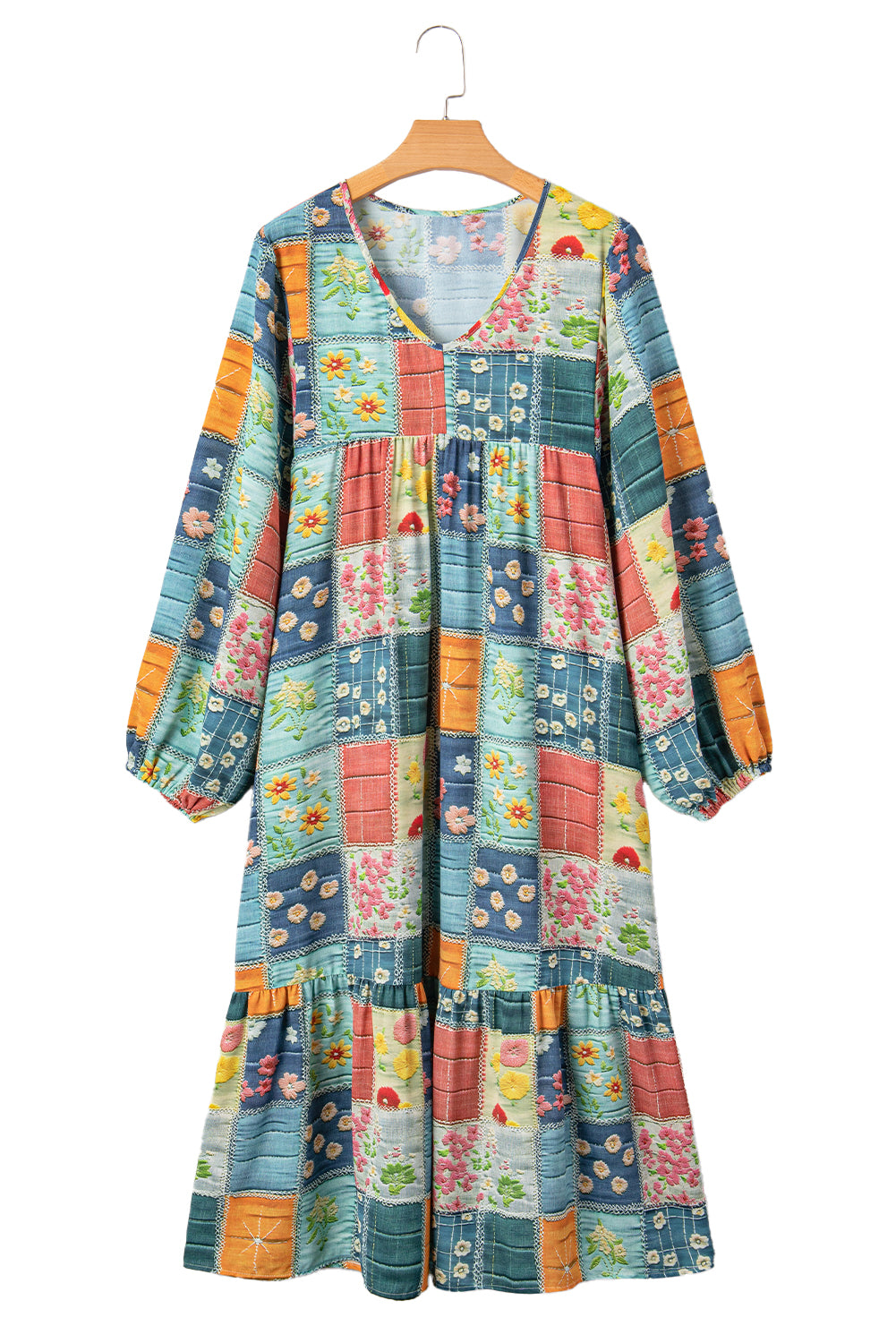 Sky Blue Floral Checkered Pattern Bubble Sleeve Ruffle Hem Dress