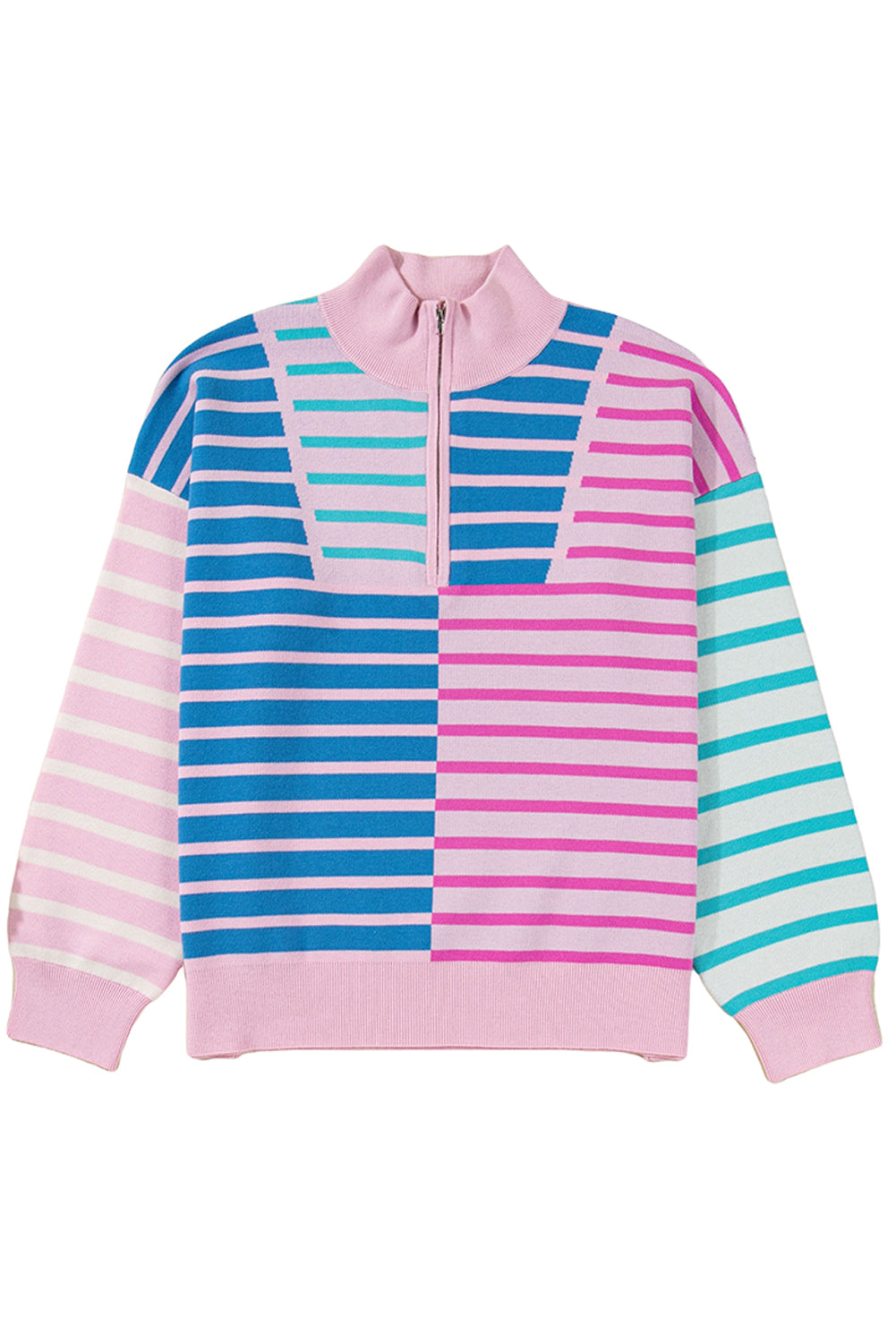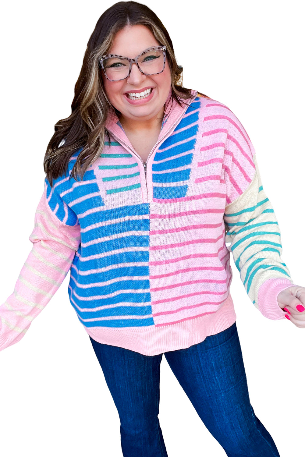 Sky Blue Stripe Colorblock Patchwork Plus Size Zip Collar Sweater