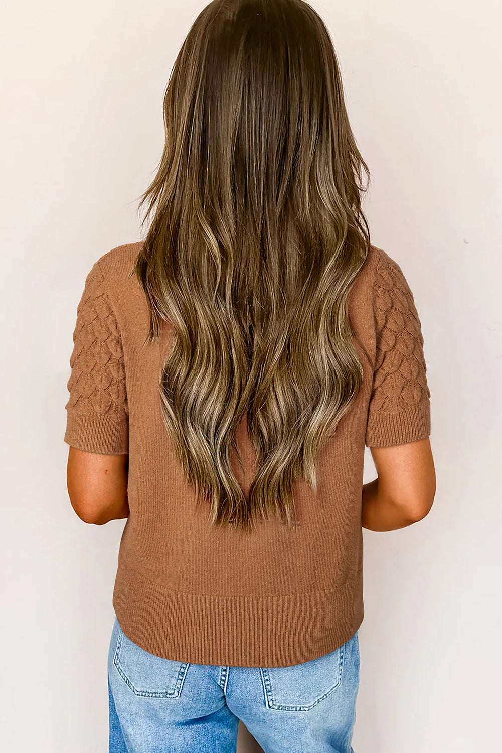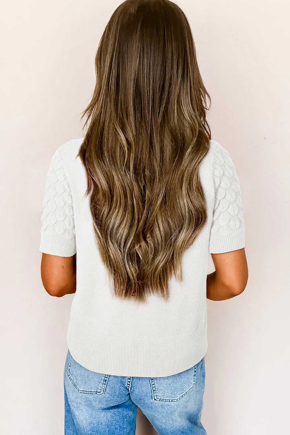 White Fish Scale Textured Knit Ribbed High Neck Short Sleeve Sweater